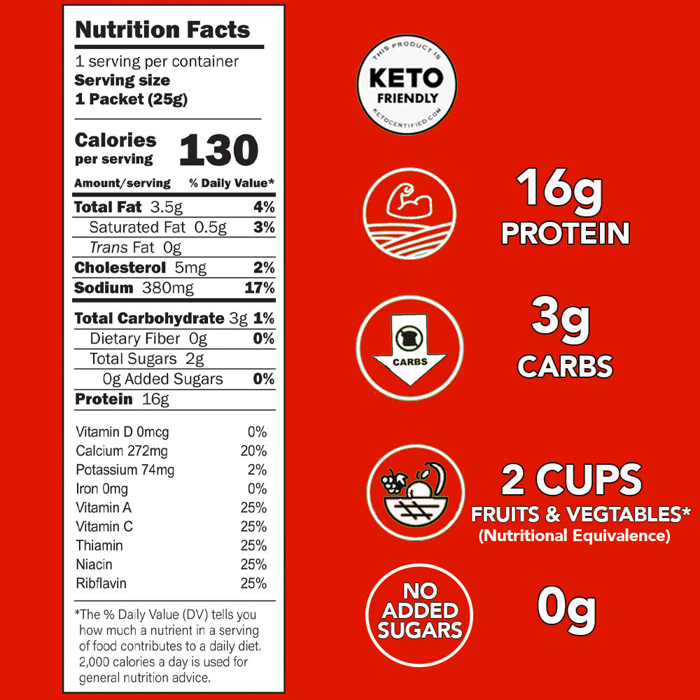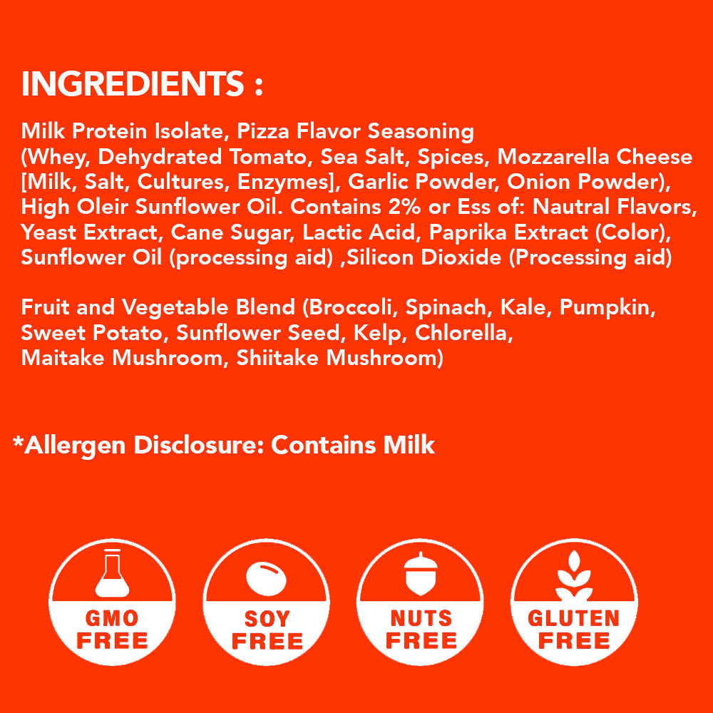 Our snacks use a vegetable blend that provide 25% of your daily vitamins and have the nutritional equivalence of 2 servings of fruits and vegetables per serving.