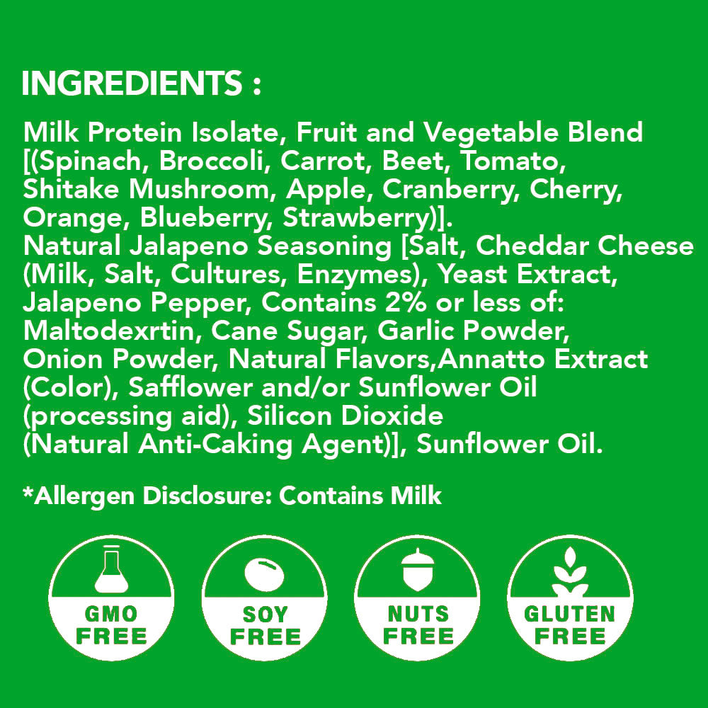 Our snacks use a vegetable blend that provide 25% of your daily vitamins and have the nutritional equivalence of 2 servings of fruits and vegetables per serving.